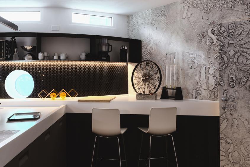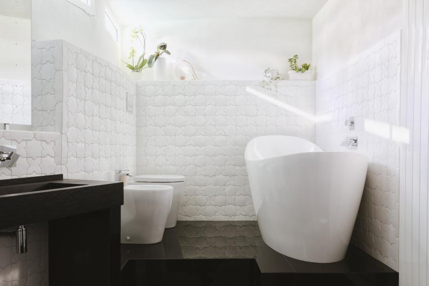 Ristrutturazione della zona giorno di un moderno villino. Rivestimento bagno: Le Croci e le Stelle small Bianco Seta. Progetto: Studio Opus Foto: Alessio Beato